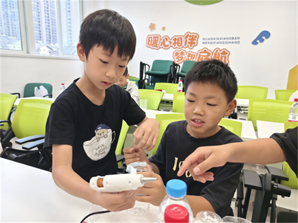 活动伊始,志愿者老师通过趣味问答和动画短片的形式,向孩子们讲解垃圾分类、资源循环利用等环保知识。通过“垃圾去哪了”“旧物新生”等互动环节,孩子们直观感受到废旧物品再创造的可能性。“我知道我知道,我们上次用蛋壳做了风铃,还用瓶盖做了摩天轮!”青少年张粤童举手分享自己参加过的活动。“我家里还用洗衣液的瓶子做了小花盆。”方淑文小朋友兴奋地分享着家里变废为宝的行动。