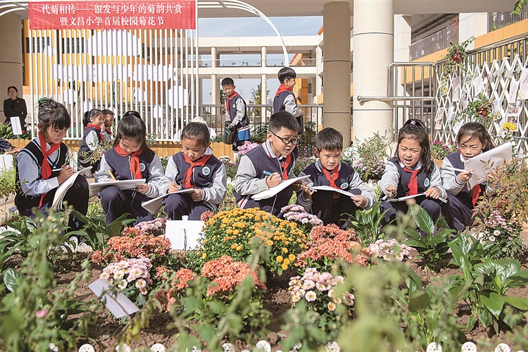 眼下,正是菊花盛开的季节。市文昌小学以菊为媒,打造花卉特色课程,让学生在学习劳动技能的同时,提升审美能力。任广真 摄