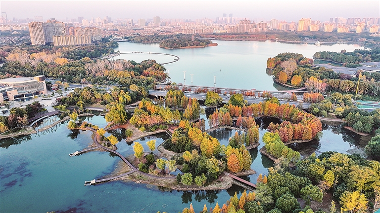 初冬时节,暨阳湖湿地公园内的水杉树换上了“新装”,在暖阳下色彩斑斓美如画。任广真 摄