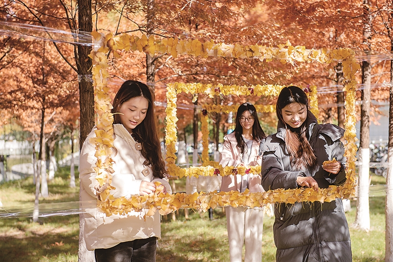 近日,在江苏科技大学张家港校区、苏州理工学院,学生们用银杏落叶制作相框、帽子等,为校园增添了几分诗意。任广真 摄