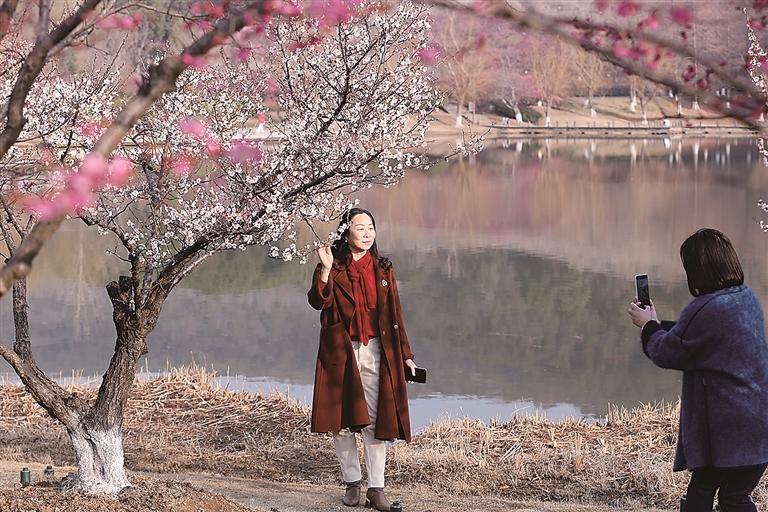 眼下,香山景区的梅花已进入最佳观赏期,一树树梅花傲然绽放,暗香浮动,吸引了众多游客前来拍照打卡。陈华东 摄