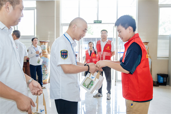 孩子们手捧清凉礼包,整齐地站成一排,向在场的每一位公交司机表达敬意。一句“师傅您辛苦了,天气这么热,感谢您一直坚守在岗位,为我们大家的安全出行保驾护航,这是我们的一点心意,希望您能喜欢。”瞬间融化了夏日的燥热。最后,司机师傅们也拿出了一份特别的礼物——公交车站自制的文创钥匙扣,回赠给孩子们。上面印有公交标志性图案,这份独特的礼物,既是对孩子们爱心的回应,也寓意着公交司机们对孩子们的关爱与祝福。