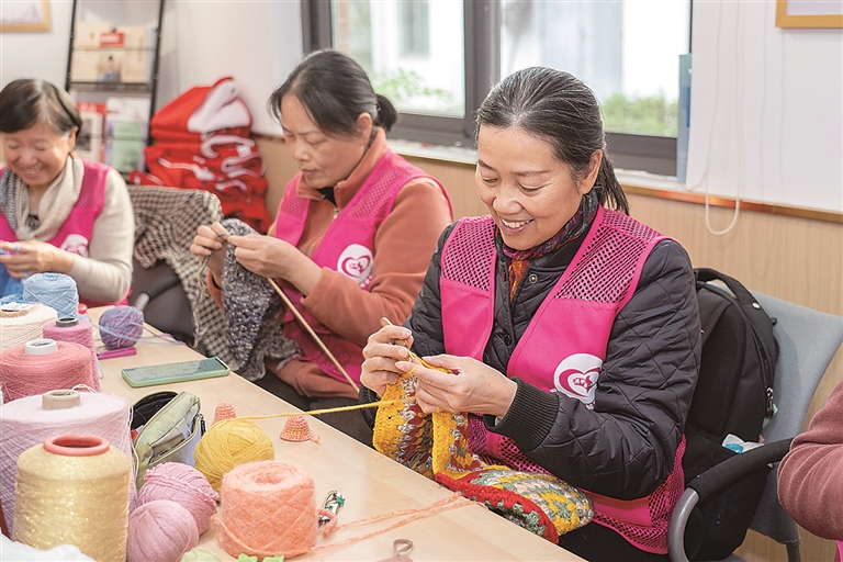 自2015年起,市港城爱心社每年编织6000~10000条围巾,寄往青海省妇女联合会以及四川省甘孜藏族自治州、凉山彝族自治州等高寒地区,为当地的藏族、彝族同胞送去温暖。图为志愿者们忙着编织围巾和小饰品。邢彬 摄